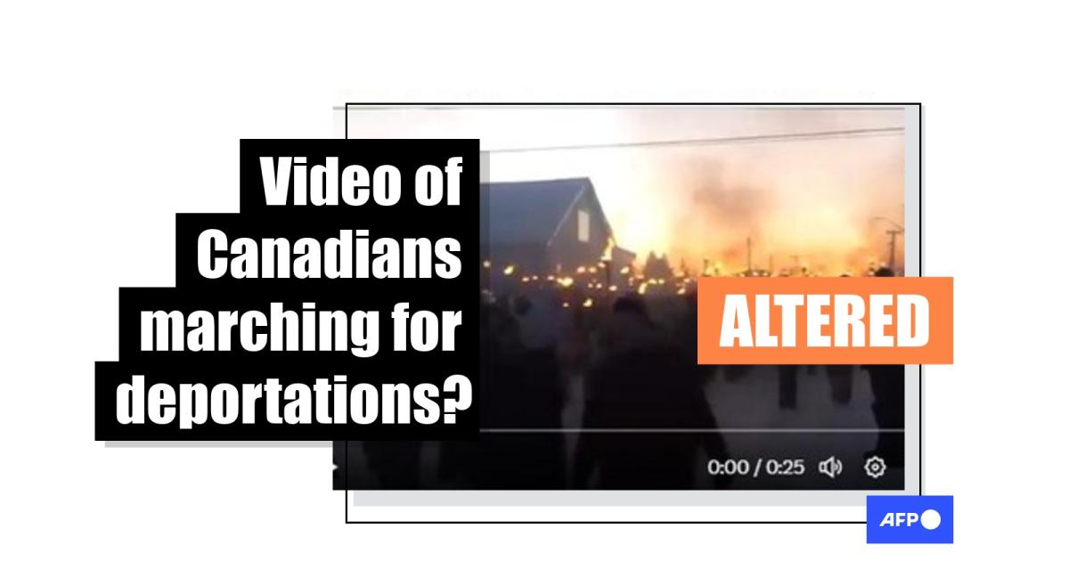 A video spreading across social media platforms claims to show torch-wielding Ontarians marching against immigrants while shouting, "Get them out!" and "Deportation!" But the clip is doctored, with unrelated audio tracks dubbed on top of footage of firefighters and other residents participating in the Cochrane Winter Carnival's "torchlight parade." The Ontario town's fire chief and chief administrative officer both told AFP the event featured no such chanting.