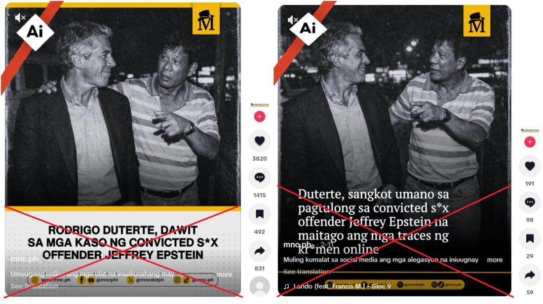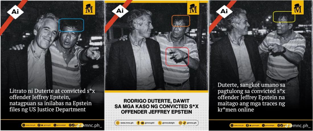 After the US government released millions of pages from files connected to Jeffrey Epstein, manipulated images of the convicted sex offender with former Philippine leader Rodrigo Duterte surfaced online. The circulating visuals were altered from an old Getty Images portrait of Epstein and US President Donald Trump, and bear errors that indicate they were created using AI.