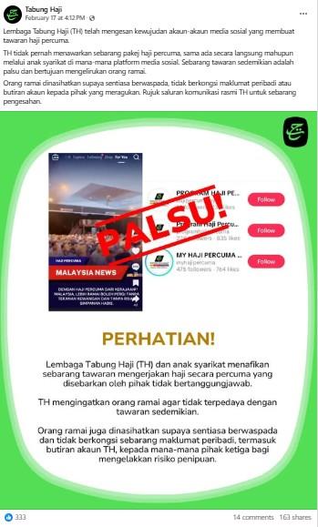 "Tabung Haji has noticed the existence of social media accounts offering free hajj," reads the Malay-language post.