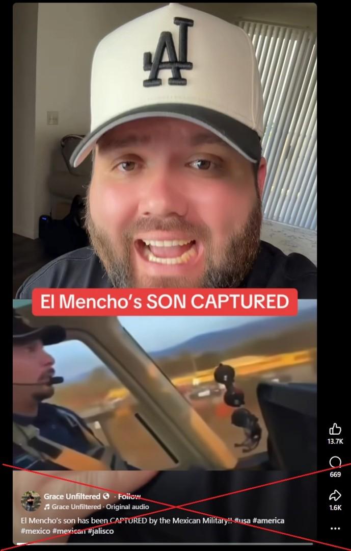 Mexico deployed 10,000 troops to quell deadly clashes sparked by the February 22, 2026 killing of the country's most-wanted drug lord Nemesio "El Mencho" Oseguera, leader of the Jalisco New Generation Cartel (CJNG). But a video claimed online to show the arrest of Oseguera's son is unrelated, and in fact shows the capture of a different drug trafficker; the younger Oseguera -- Rubén -- was arrested in 2015.