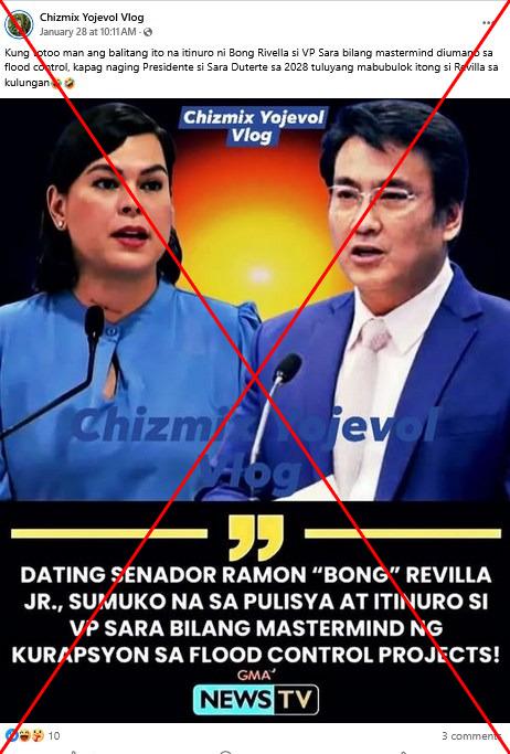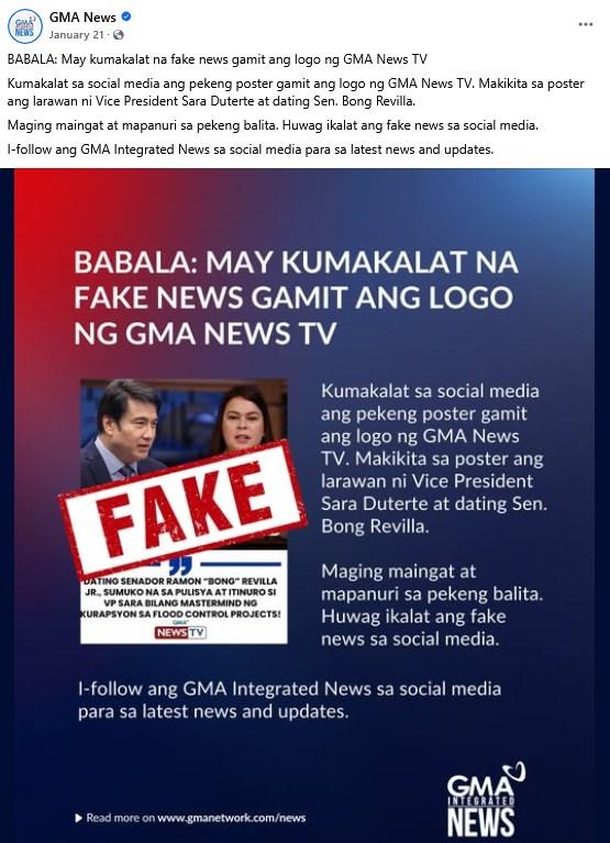 A news graphic that bears local broadcaster GMA's logo and photos of Vice President Sara Duterte and former senator Revilla was shared in a Facebook post on January 28.