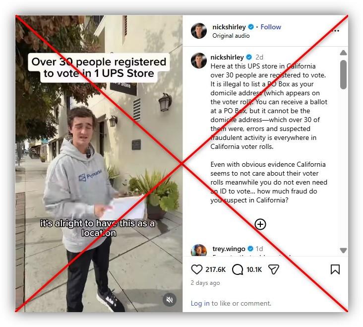 Right-wing YouTuber Nick Shirley is claiming more than 30 people illegally registered to vote at the same United Parcel Service (UPS) location in San Diego, California. But the San Diego County registrar of voters and California secretary of state's office said there are no voters registered to the suite number of the store, which is part of a multi-use development that also includes a 34-unit apartment complex under the same street address.