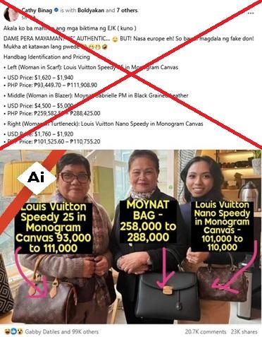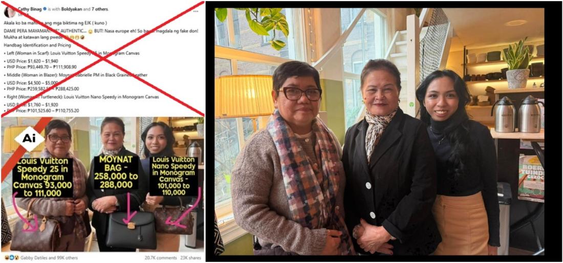 Advocates and families of drug war victims traveled to The Hague to witness the International Criminal Court commence proceedings against former president Rodrigo Duterte, but a viral image showing them with luxury handbags is digitally altered. The image was flagged as made with Google's AI tools and the original photos uploaded by a Philippine news outlet showed they were not carrying anything.