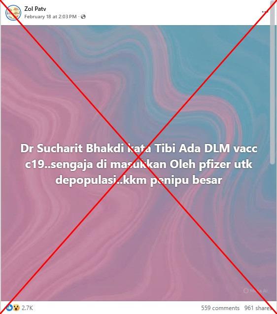 "Dr Sucharit Bhakdi says that the tuberculosis bacteria is in the Covid-19 vaccine..it was deliberately inserted by Pfizer for depopulation purposes," reads a Malay-language Facebook post shared on February 18, 2026.