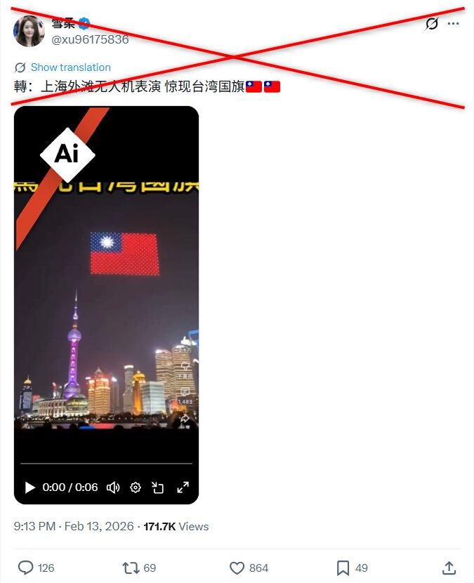 "A drone show at the Bund in Shanghai unexpectedly features the Taiwan flag," reads a simplified Chinese X post shared on February 13, 2026.