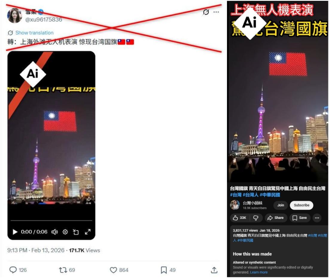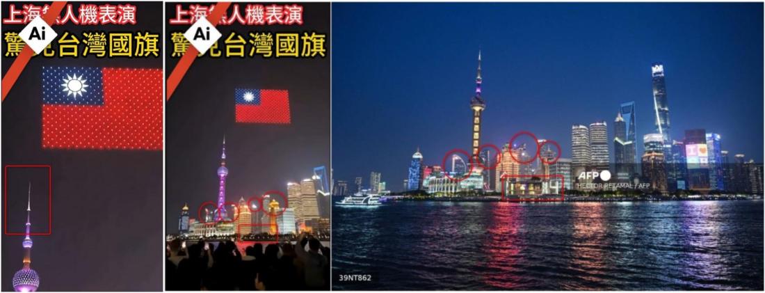 Misinformation on ties between China and Taiwan has circulated on social media as tensions mount, with the latest being an AI-generated video that purports to show a drone show held in Shanghai that featured the self-ruling island's flag. An analysis shows the clip was made with AI and contains visual inconsistencies indicative of synthetic content.