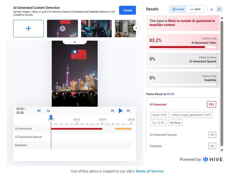 An analysis of the video using the Hive Moderation AI video detection tool found it was "likely to contain AI-generated or deepfake content" (archived link).