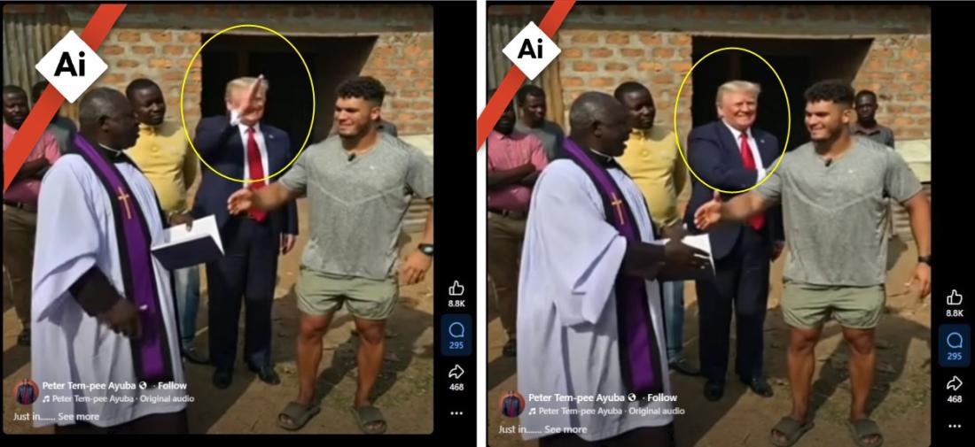 At the end of the video, Trump appears to raise his hand for a handshake, but then drops it back down without making contact with anyone -- a common glitch in AI-generated footage.