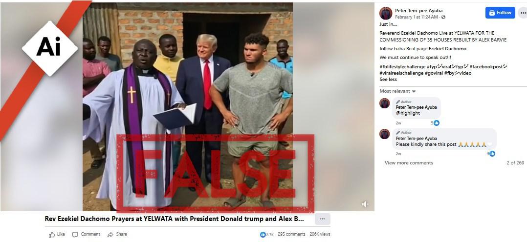 “Just in… Reverend Ezekiel Dachomo Live at YELWATA FOR THE COMMISSIONING OF 35 HOUSES REBUILT BY ALEX BARVIE (sic),” reads the caption of a video published on Facebook on February 1, 2026.
