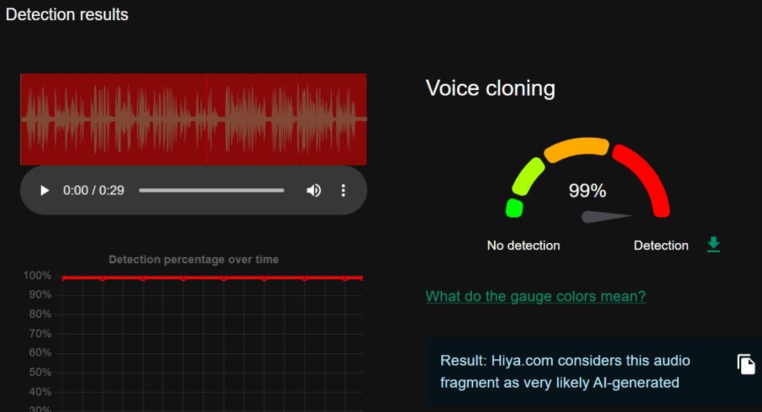 An analysis of the audio extracted from the video using the Hiya AI detection tool suggested a high probability that it was created using artificial intelligence.