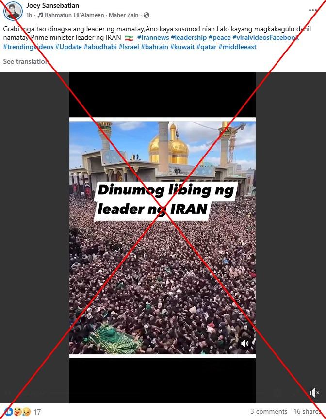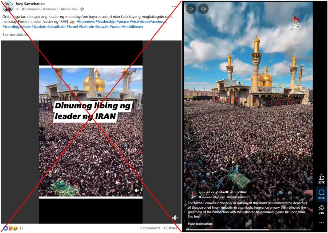"Crowds swarmed the funeral of Iran's leader," reads Tagalog-language text over a Facebook video shared on March 2, 2026.