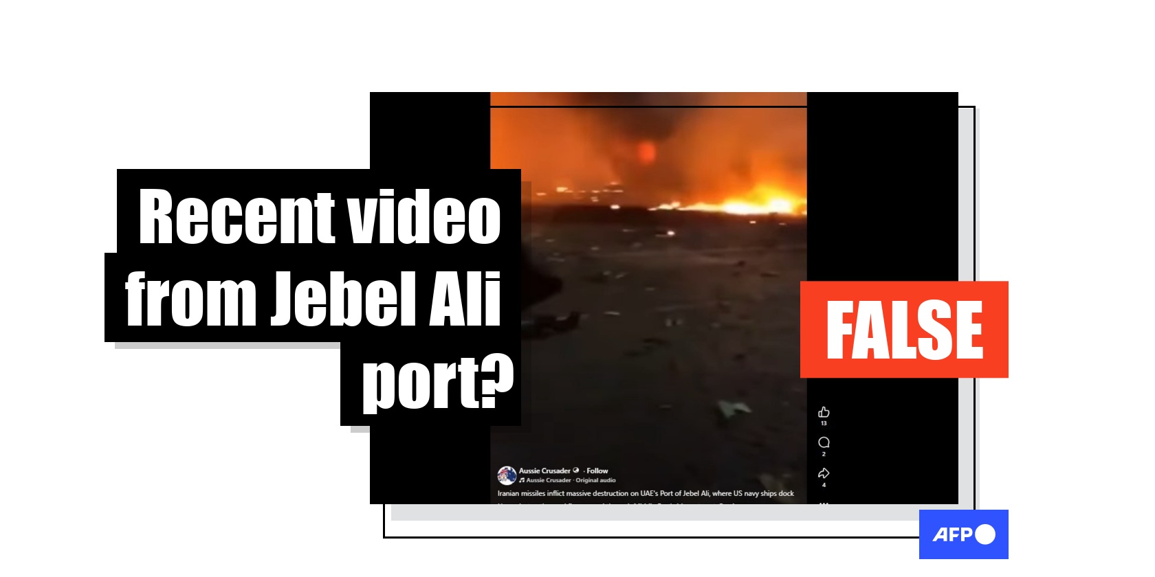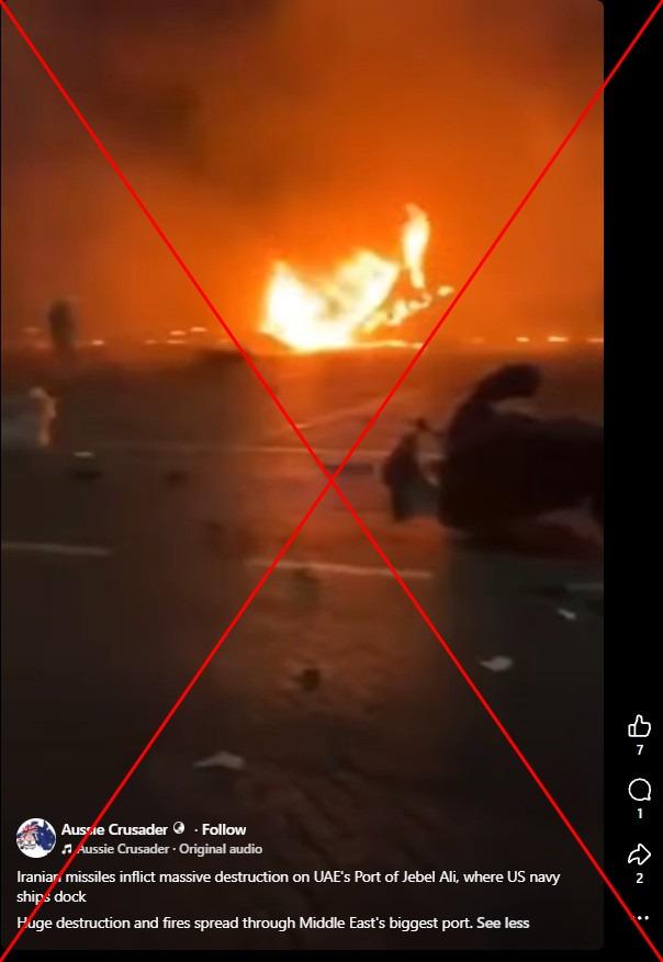 "Iranian missiles inflict massive destruction on UAE's Port of Jebel Ali, where US navy ships dock," reads the caption to the video shared March 1, 2026 by an Australia-based Facebook user.
