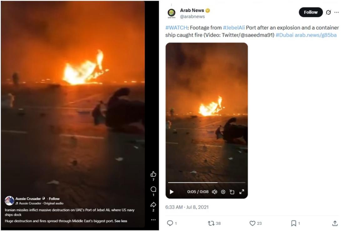 Dubai's massive Jebel Ali port caught fire as Iran unleashed missiles and drones across the Middle East, in retaliation for US-Israeli strikes on the Islamic republic. But footage circulating online supposedly depicting the blaze is from 2021, when a container ship burned at the same port.