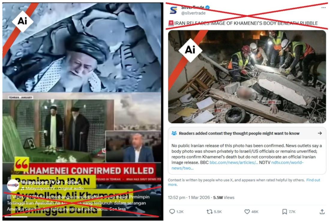 "International media revealed a photo of the body of Iran's Supreme Leader Ayatollah Ali Khamenei, who was killed in an attack by the United States and its ally Israel on Saturday," reads the Malay-language caption of an image shared on Facebook on March 1, 2026.