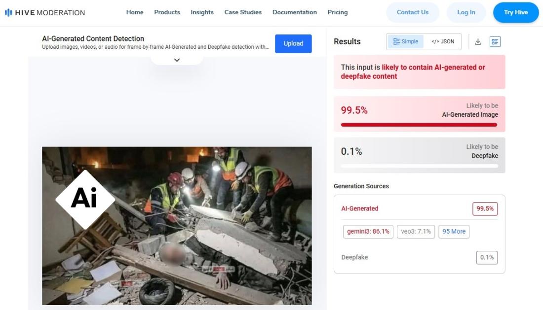 An analysis of the second falsely shared image by the Hive Moderation AI video detector also found it was "likely to contain AI-generated or deepfake content" (archived link).