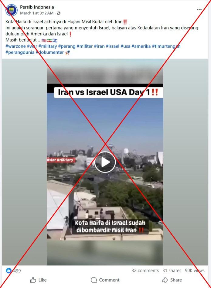 "The city of Haifa in Israel is bombarded by Iranian missiles," reads the Indonesian-language caption of a video of explosions around a building shared on Facebook on March 1.