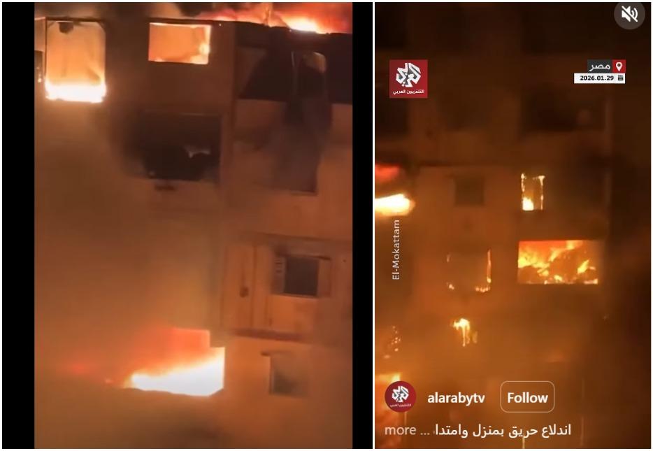 Another reverse image search on keyframes of the clip showing a building filled with smoke and fire found a similar video shared on the Instagram account of Qatari broadcaster Alaraby TV -- crediting Facebook page El-Mokattam -- on January 29, 2026 (archived link).
