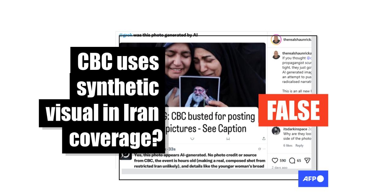 Social media users and vloggers are claiming the Canadian Broadcasting Corporation (CBC) ran an image generated by artificial intelligence in an article on the Iranian supreme leader killed by US-Israeli strikes. But while some have objected to the CBC's use of the picture of two women crying, the claims that it is fake appear to have originated with a hallucinated response from X's chatbot Grok; the original photo was distributed by Reuters and published by several other news organizations.