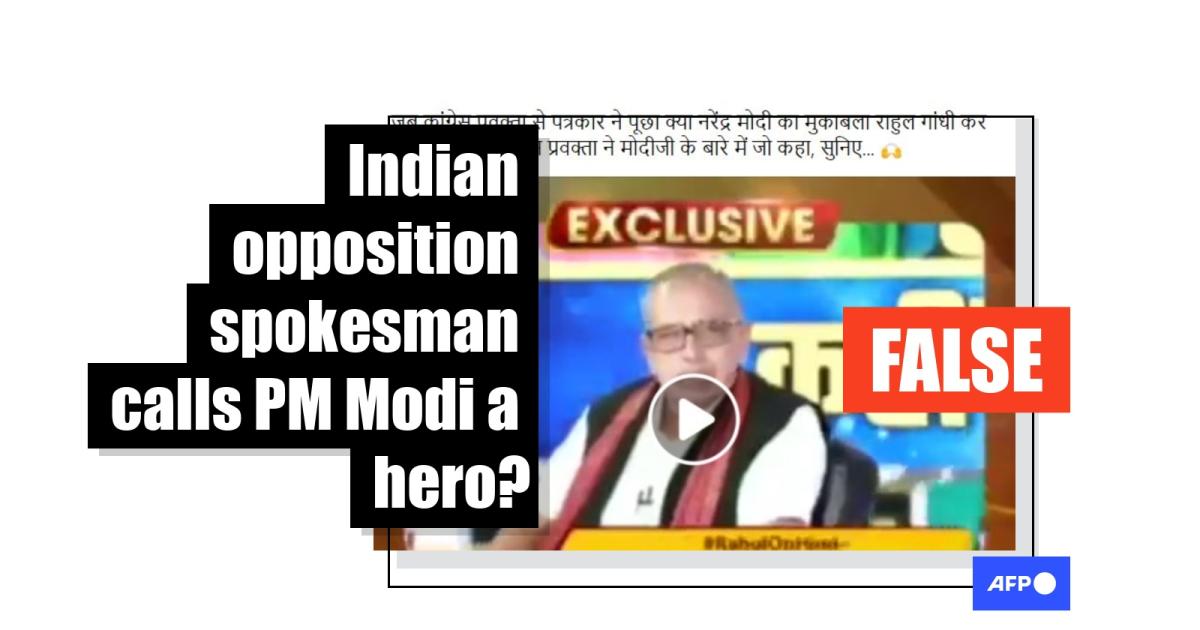 A video has been viewed thousands of times in social media posts that claim it shows a "spokesman for India's main opposition party" calling Prime Minister Narendra Modi a "hero" ahead of upcoming polls in the country's northern Uttar Pradesh state. The claim is false; the video shows Indian news channel head Jagdeesh Chandra praising Modi in a television interview. A representative for Chandra -- who has been vocal about his support for Modi and the ruling Bharatiya Janata Party -- told AFP he is not affiliated with the main opposition Congress party.