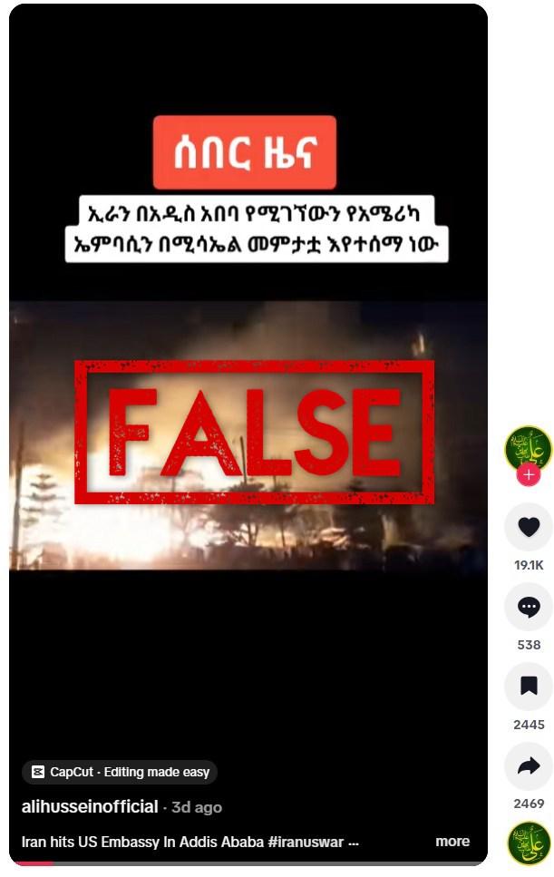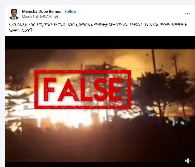 The same clip was shared on Facebook on March 3, 2026, and claimed in Amharic: “Iran has bombed the American embassy in Addis Ababa with a missile. This is fine to me; Iran is smart.”