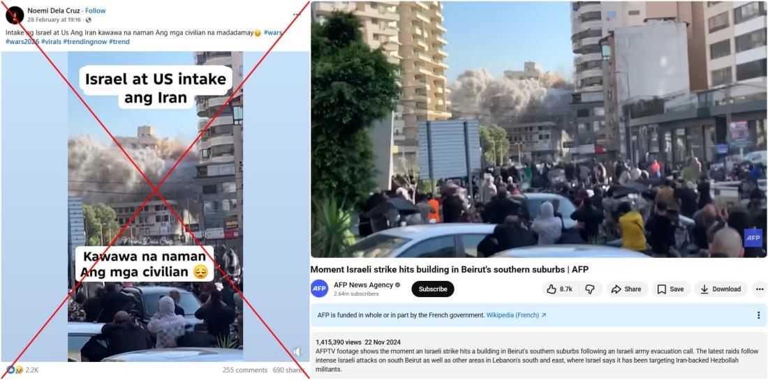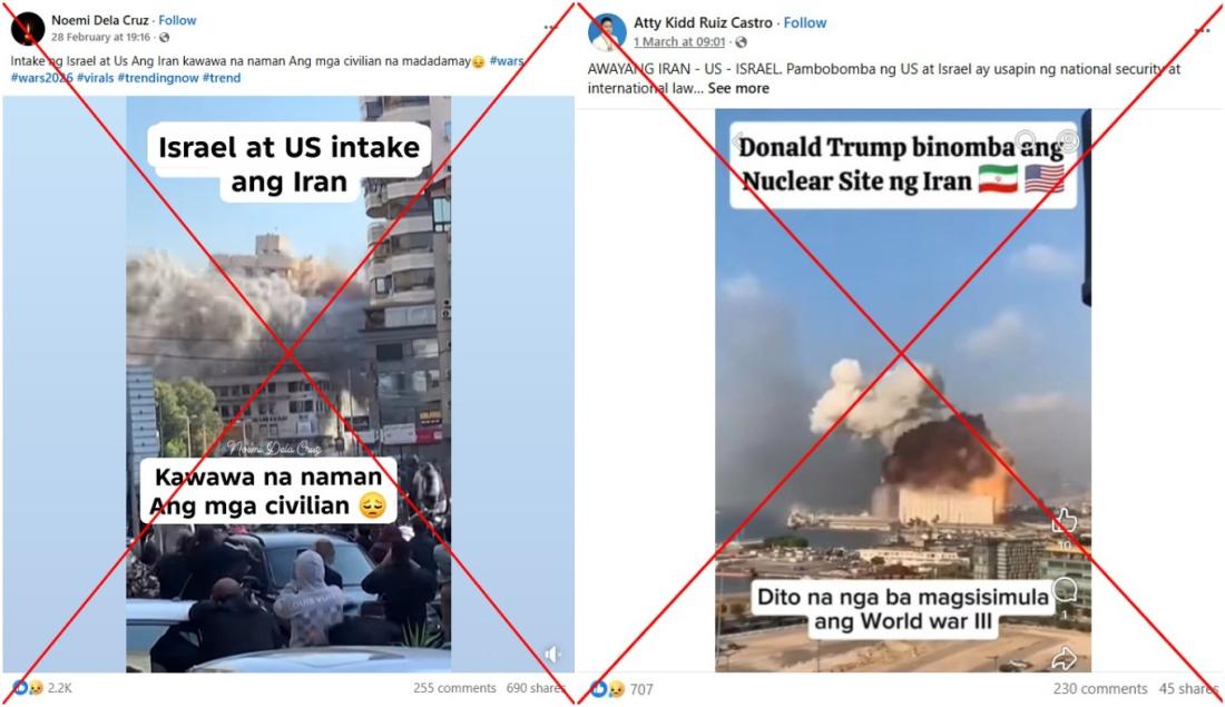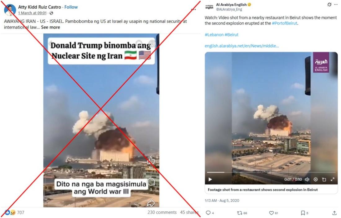 A separate Facebook post from March 1 also shares what it claims is an image of US-Israeli strikes on Iran, overlaying the picture with Tagalog-language text that says: "Donald Trump bombed Iran. Is this the start of World War III?"