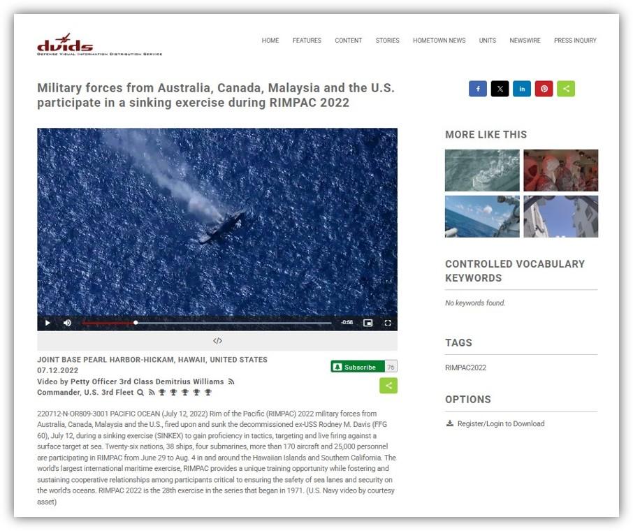 The DVIDS site hosts several other videos of the same exercise, with descriptions indicating that the targeted ship, the ex-USS Rodney M. Davis, was cleaned ahead of the sinking to remove all environmentally harmful material (archived here, here and here).