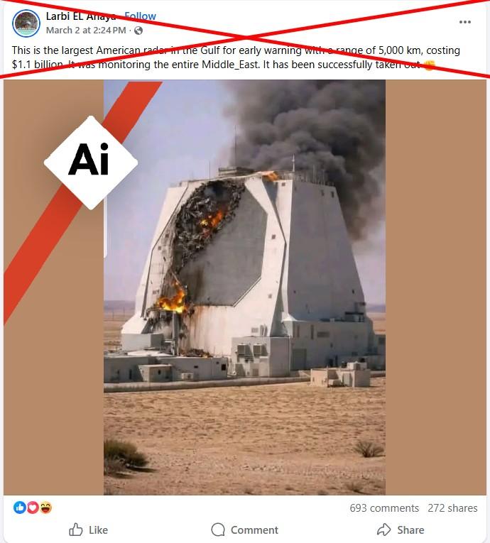 Iran has launched retaliatory attacks on US targets in multiple Middle East countries amid a war triggered by US-Israeli strikes on Tehran, and satellite imagery suggests a key radar system in Qatar was impacted. But a dramatic image spread online that purports to show the structure on fire appears to have been generated using artificial intelligence.