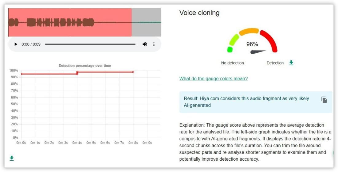 An Arabic voice repeats the claim in the audio, which the Hiya voice-cloning detector recognised as AI-generated with 96 percent probability.