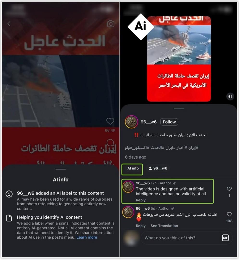 “Urgent: Iran is sinking the US aircraft carrier in the Red Sea now!" reads the edited Arabic caption.
