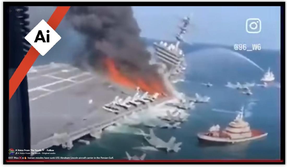 A day after war broke out in the Middle East, Iran claimed it had struck the aircraft carrier USS Abraham Lincoln in retaliation for attacks carried out by Israel and the United States. Soon after, social media posts began circulating various videos purporting to show the carrier sinking and on fire, including one clip of the nuclear-powered warship listing at sea. However, the footage was created using artificial intelligence. The Pentagon and US Central Command denied that the Nimitz-class vessel was hit.