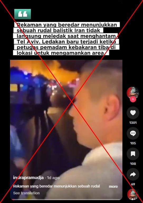 "Circulating footage shows an Iranian ballistic missile did not immediately explode when it hit Tel Aviv. It exploded when firefighters arrived at the scene," says Indonesian-language text over a TikTok video shared on March 8, 2026.