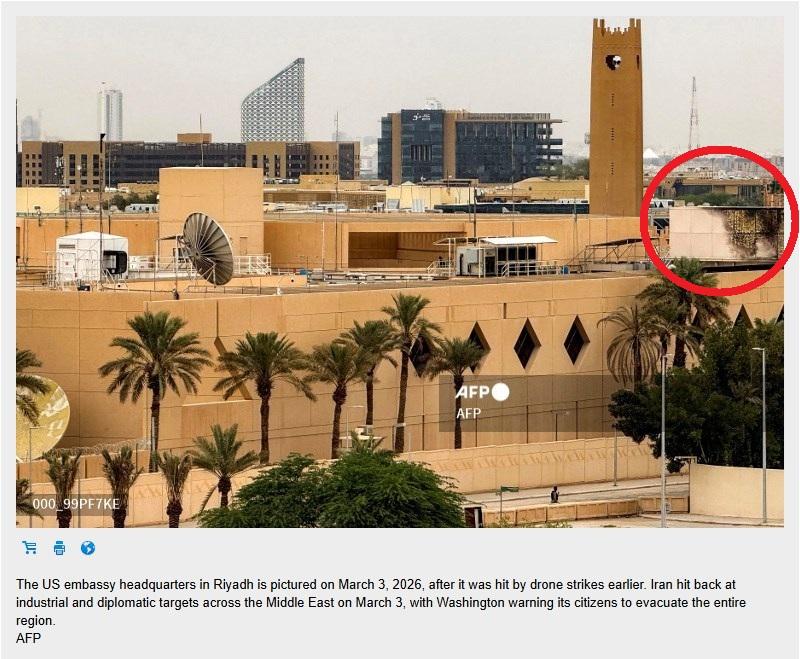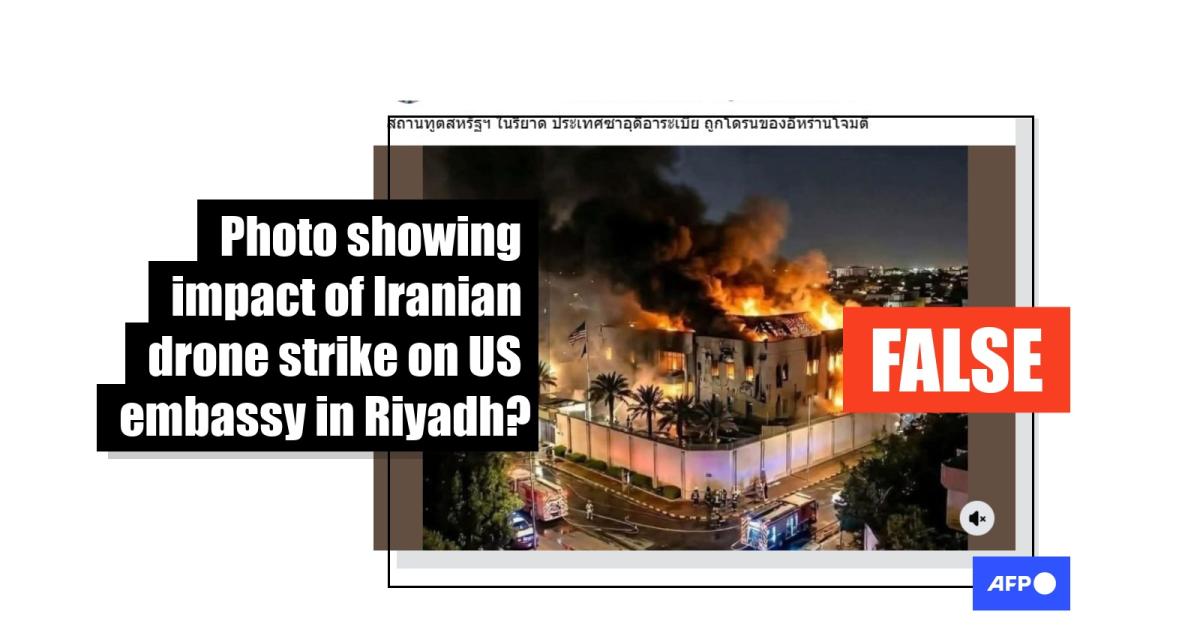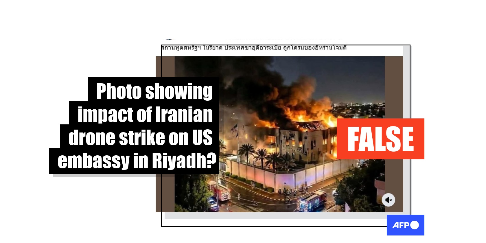 It circulated after a Saudi defence ministry spokesman said an attack by two drones on the US embassy in Riyadh early on March 3 had sparked a small fire (archived link). The embassy later confirmed an attack on the facility and urged people to stay away.