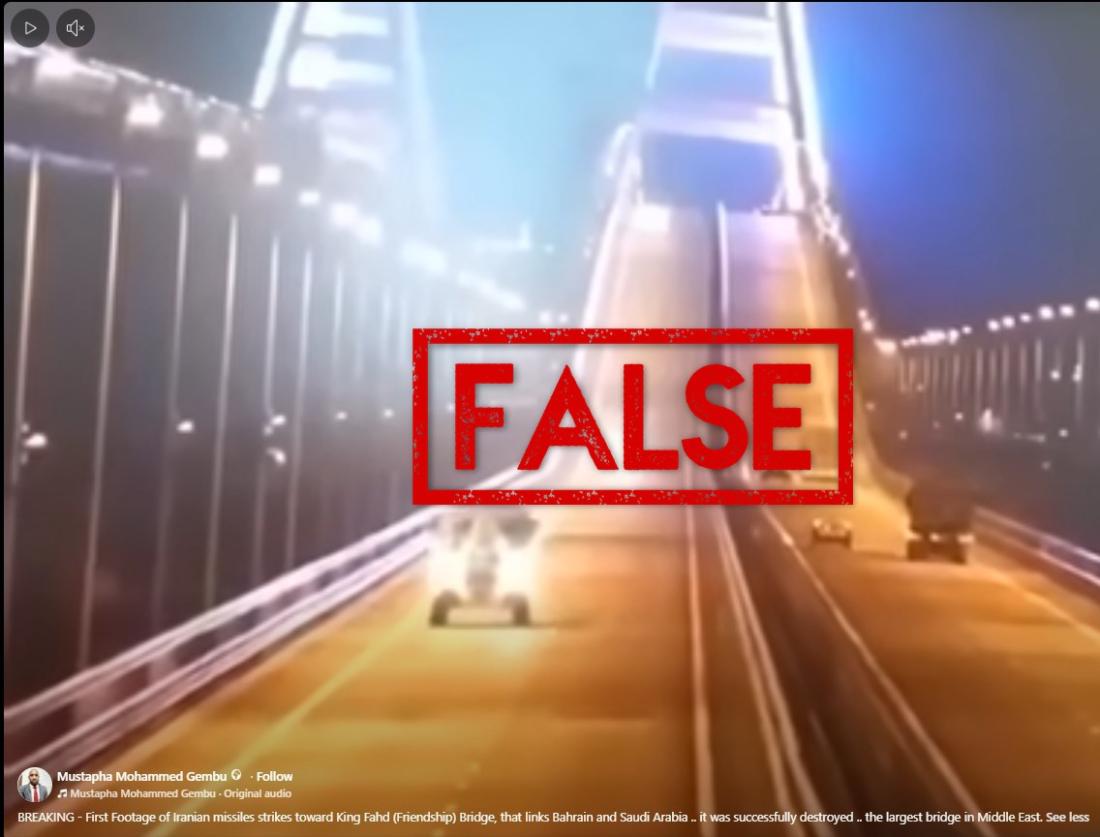 The post, shared by a Facebook account from Nigeria, reads: “BREAKING - First Footage of Iranian missiles strikes toward King Fahd (Friendship) Bridge, that links Bahrain and Saudi Arabia (sic).”