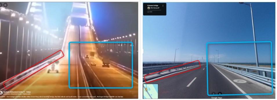 The architectural design of the bridge shown in the CCTV footage, including the road lanes and roadside features, also match that of the Kerch bridge in Crimea.