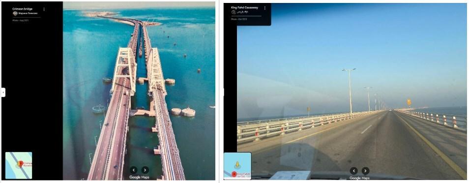 AFP Fact Check geolocated the Crimean bridge and King Fahd Causeway on Google Maps to show that the two structures are materially different.