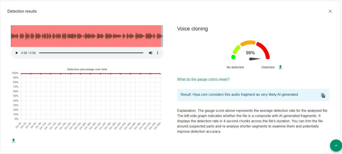 An analysis of the video's audio using the Hiya voice-cloning detection tool, available on the Verification Plugin, also known as InVID-WeVerify, found a 99 percent chance it was AI-generated.