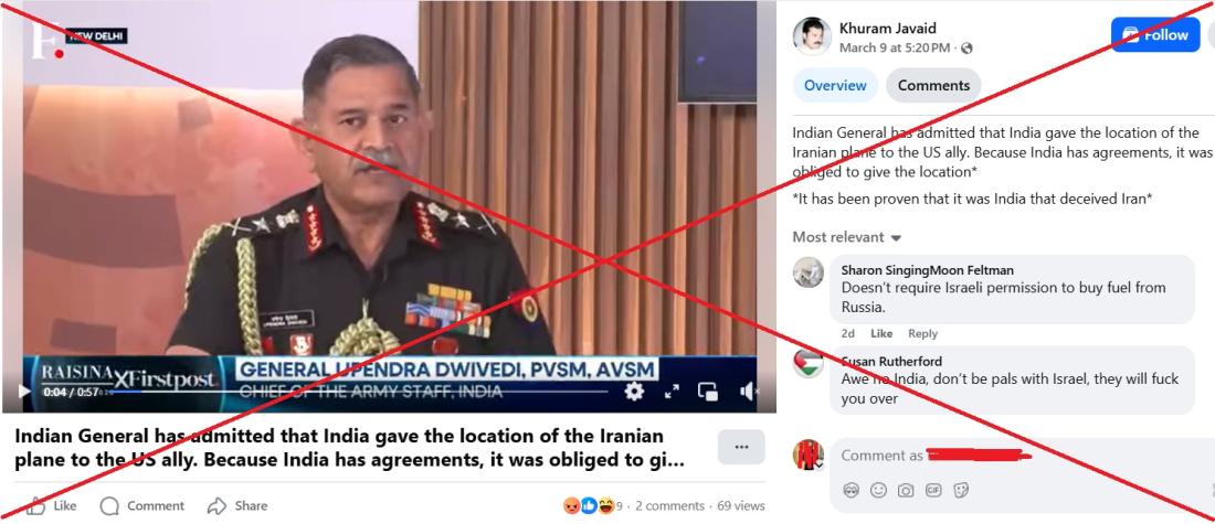 "The Indian General has admitted that India gave the location of the Iranian plane to the US ally," reads a March 13, 2026, Facebook post sharing a clip of India's Chief of Army Staff Upendra Dwivedi giving a speech.