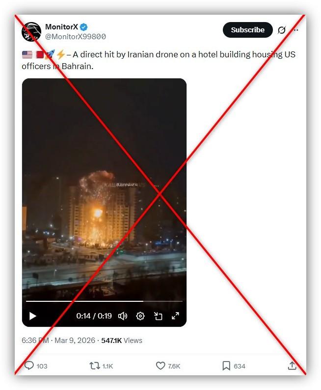 "A direct hit by Iranian drone on a hotel building housing US officers in Bahrain," says a March 9, 2026 post on X.
