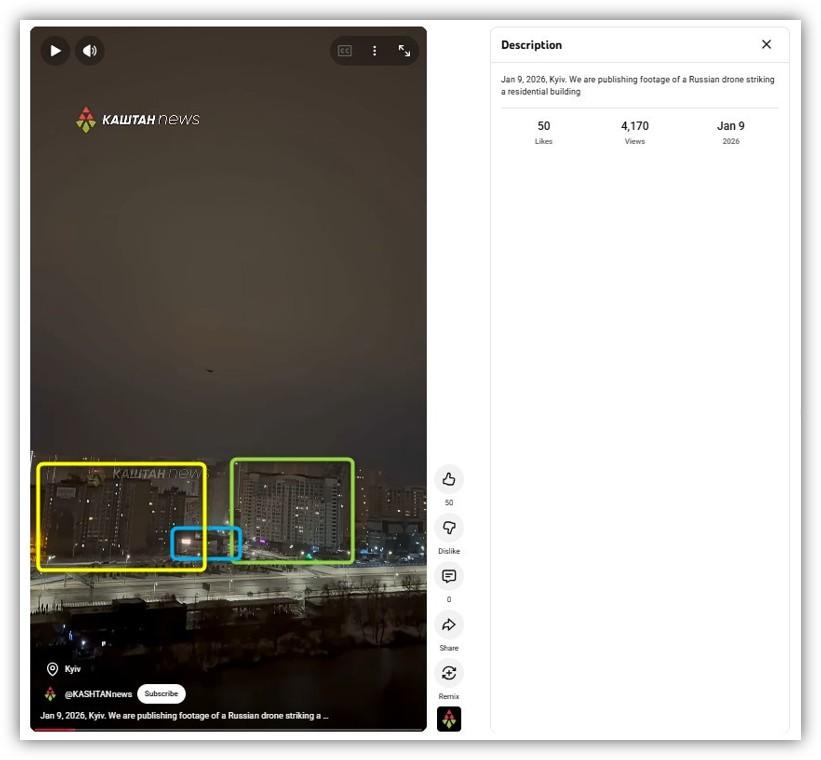 Reverse image searches traced the footage to a video the Ukrainian YouTube channel "@KASHTANnews" uploaded January 9 (archived here). The video's description reads: "Jan 9, 2026, Kyiv. We are publishing footage of a Russian drone striking a residential building."