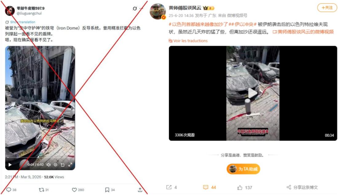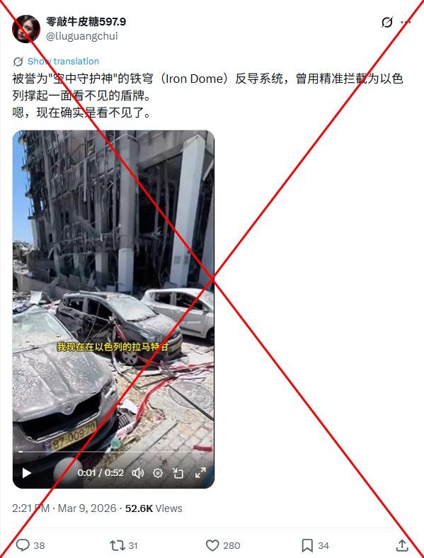 "The Iron Dome missile defence system, hailed as the 'Guardian of the Skies', once provided Israel with an invisible shield through precise interceptions. Yes, it truly is invisible now," says a simplified Chinese X post published on March 9, 2026.