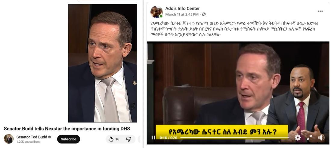 In March 2026, US Secretary of State Marco Rubio and Ethiopian Prime Minister Abiy Ahmed held a call to discuss strengthening bilateral relations. Around this time, Facebook posts shared a video purportedly showing US Senator John Thune lauding Abiy for working “tirelessly in the desert and forests”. However, the footage has been altered and the senator misidentified. The original video shows Senator Ted Budd discussing the war against Iran and the importance of defence funding, with no mention of Abiy.