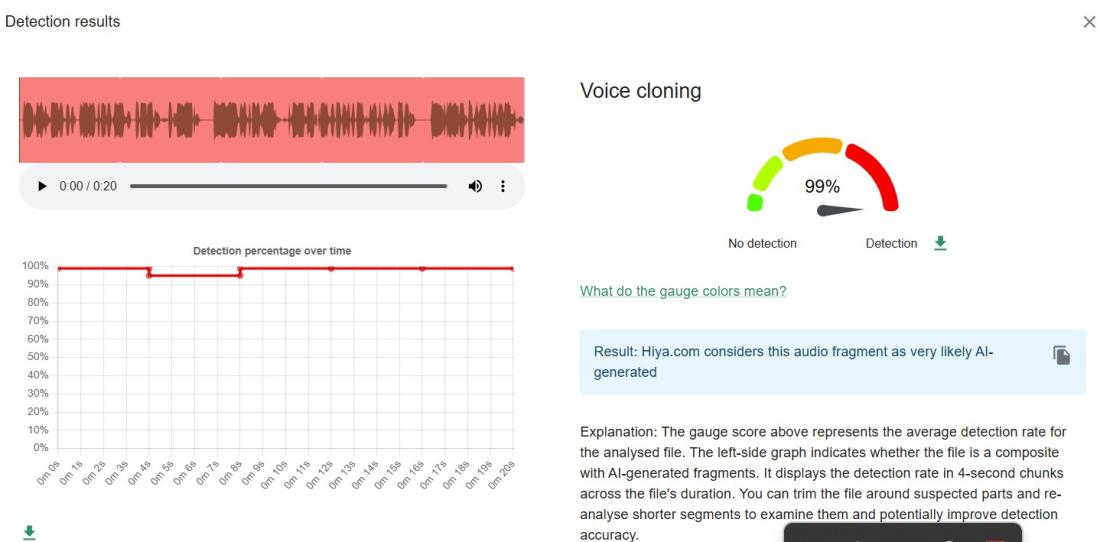 Analysis of the voice using the AI audio detector Hiya suggested a 99 percent probability of voice cloning.
