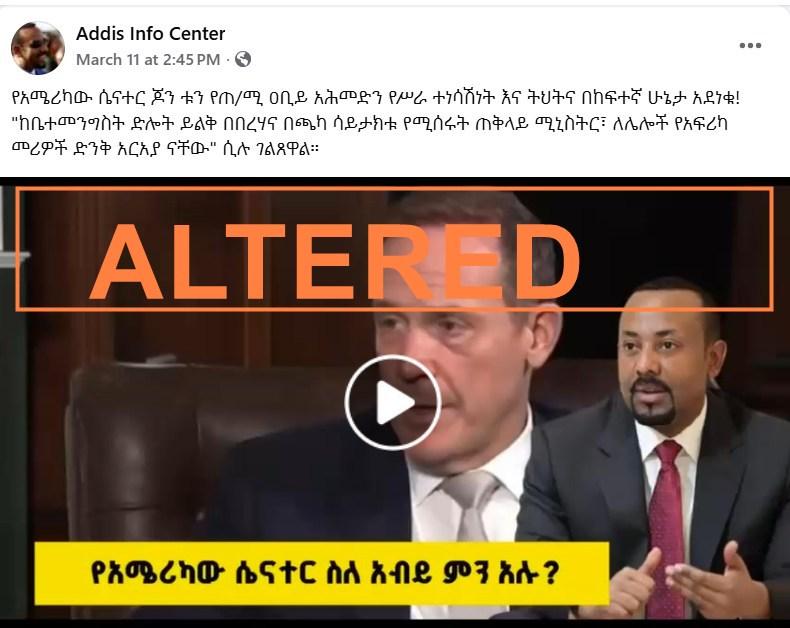 Doctored video misidentifies US senator and fabricates praise for Ethiopian leader