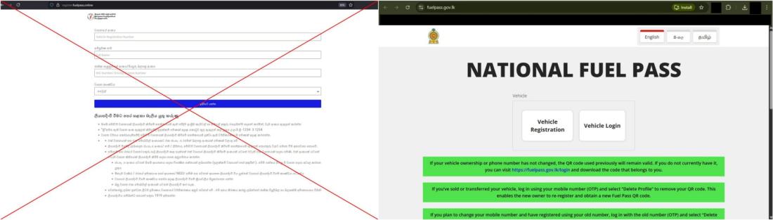 The falsely shared website does not contain the government's "gov.lk" domain in its URL, and also differs in style from the official fuel pass registration website which bears the country's national emblem.