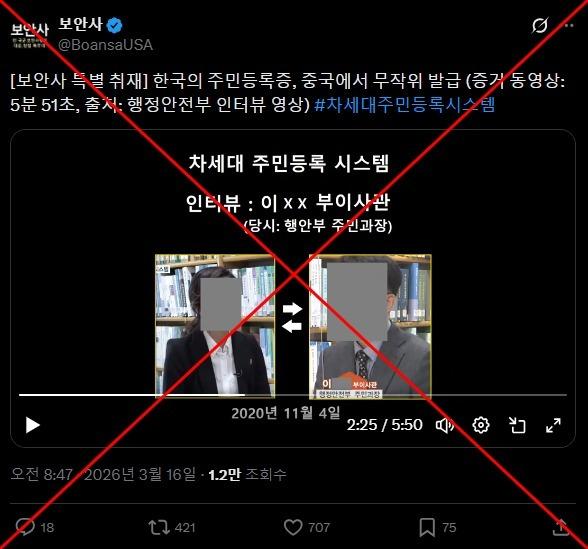 "South Korean resident registration cards being randomly issued in China," says the Korean-language caption of an X video shared on March 16, 2026.