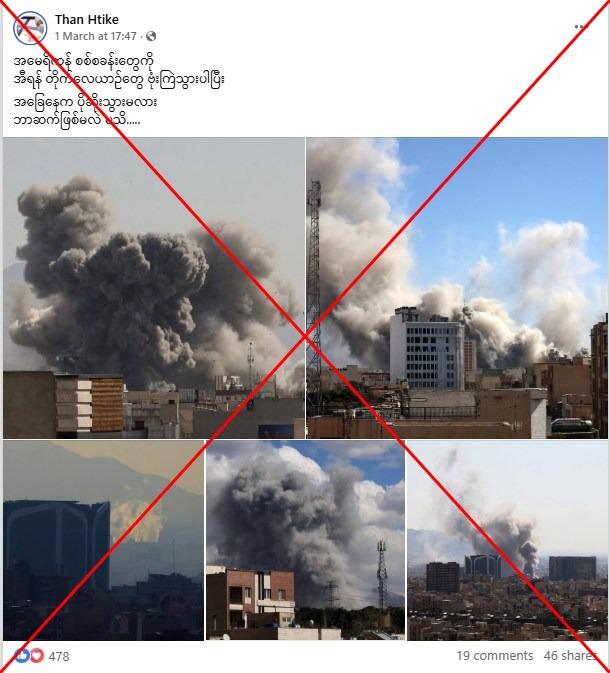 "Iranian fighter jets bombed US military bases," reads part of a Burmese-language Facebook post published on March 1, 2026.