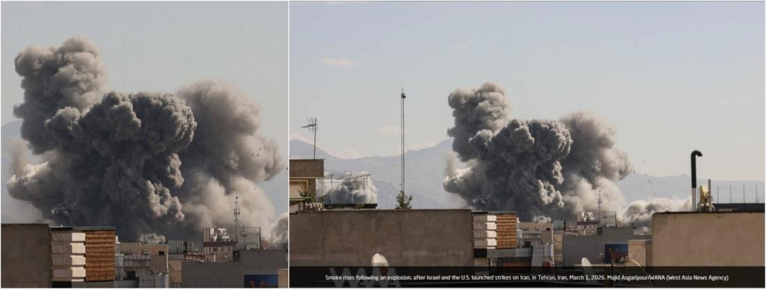"Plumes of smoke rise following reported explosions in Tehran on March 1, 2026," the captions state.