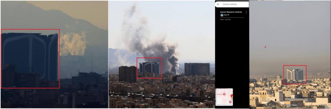The square building seen in the photos is the Cancer Institute in Tehran, which can be seen in a geotagged photo on Google Maps (archived link).