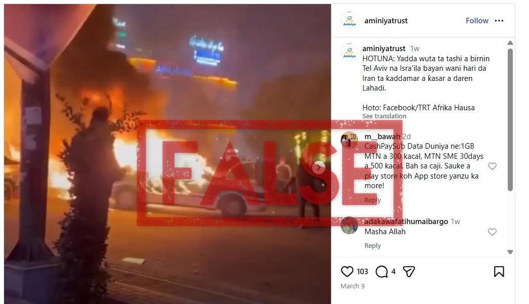 “PICTURES: How fire broke out in Tel Aviv city Israel after an Iranian attack on the country Sunday night,” reads the caption of an Instagram post translated from Hausa, a local Nigerian language, and published on March 9, 2026.