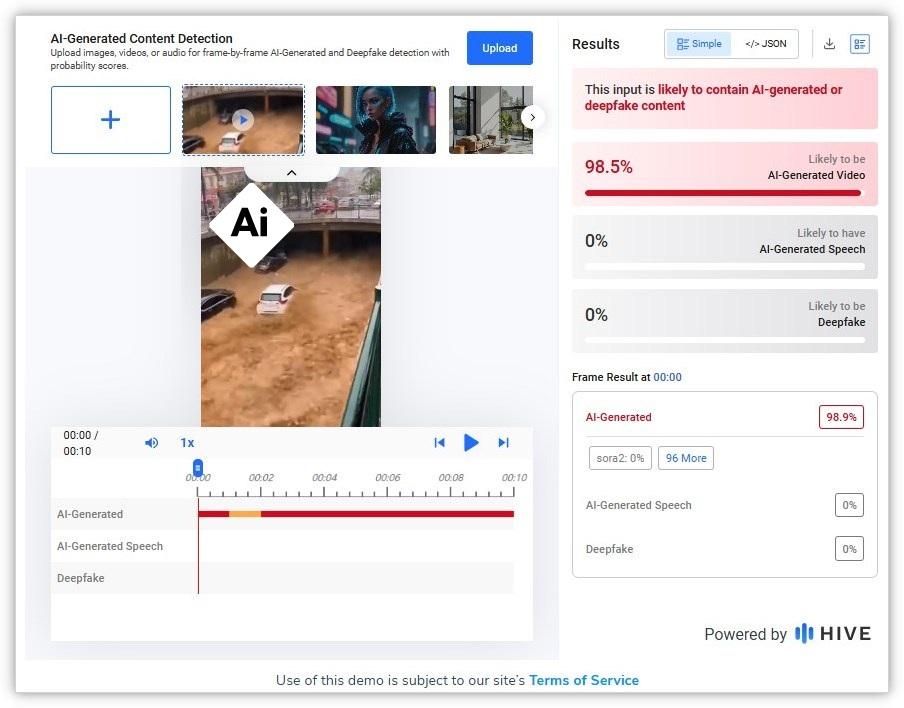 Hive Moderation analysis also found a 93 percent probability that the clip was AI-generated.